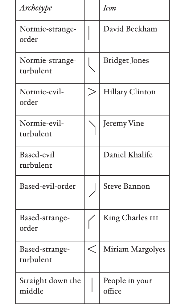 Everyone is a freak, on some level. But does your freakiness manifest as strangeness or evil? Strangeness can be being obsessed with the Elizabeth line, ironing socks, or having an eerie fascination with dishwasher stacking. You know it when you see it. Strangeness is mostly benign but, when mixed with being based and turbulent, it can be lethal. Evil is also straightforward. Do you seek to control, manipulate, and bend the world to your whims? Again, you know it when you see it.